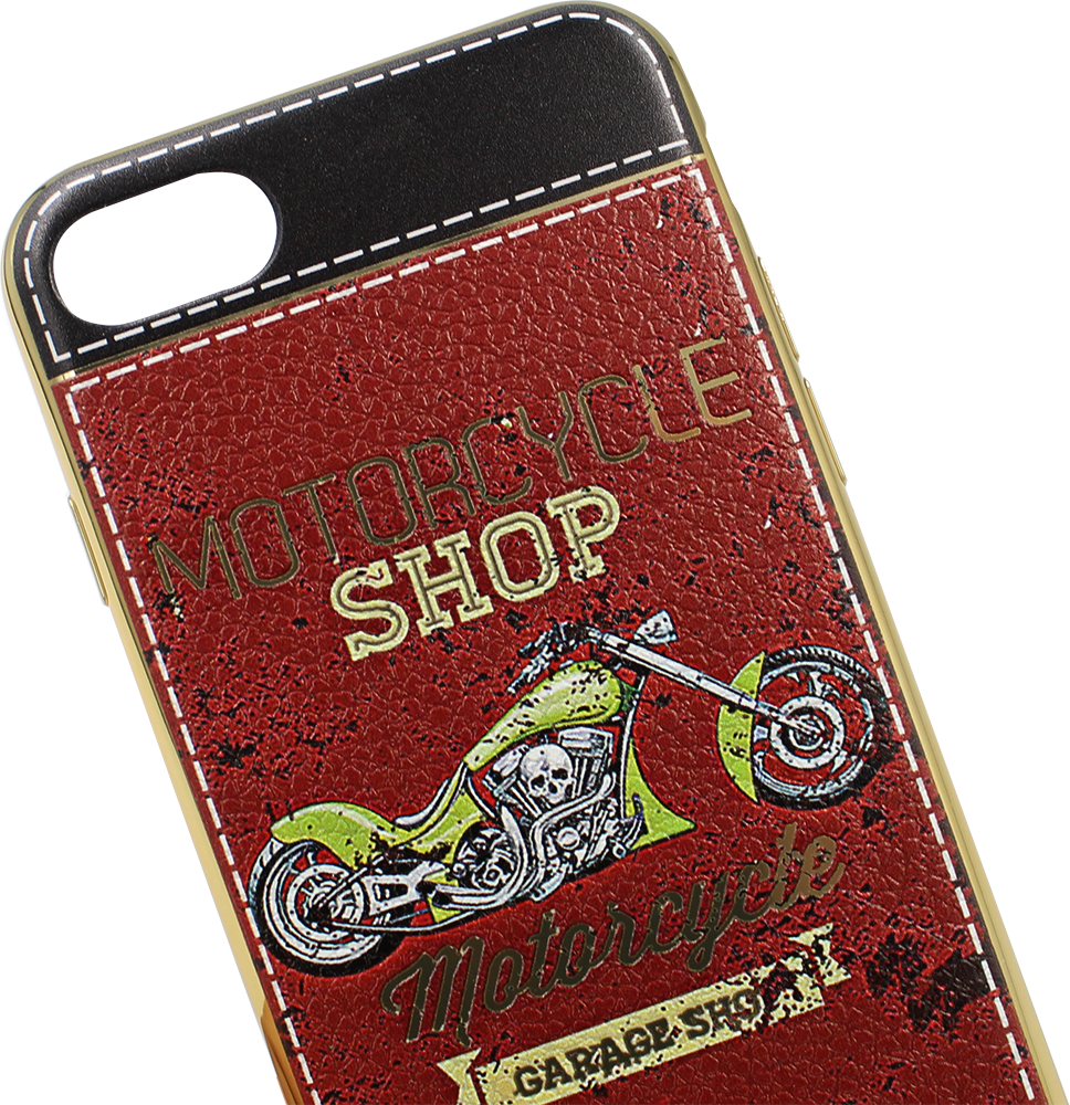 Apple iPhone 7 szilikon tok bőrhatásúszilikon tok bőrhatású motorcycle shop mintás piros/fekete, arany kerettel leírása