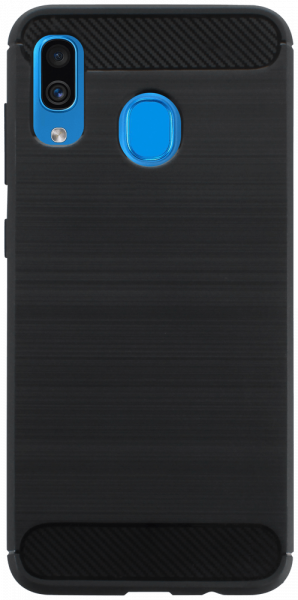 Tervezhető Samsung Galaxy A20 (SM-205) ütésálló szilikon tok szálcsiszolt-karbon minta légpárnás sarok fekete